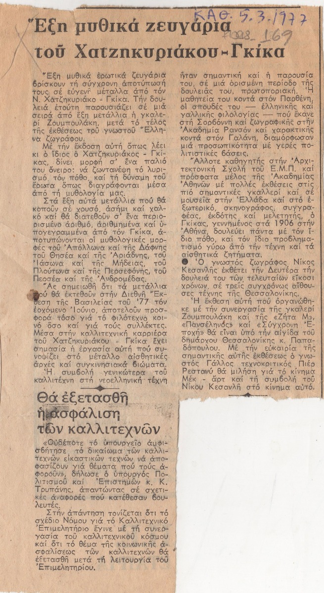 A clipping from the newspaper “I Kathimerini”, dated March 5, 1977, featuring an article about the release of a series of medals by Nikos Chatzikyriakos-Gkikas, presented by the Iola-Zoumboulakis Gallery in Athens. The article also references a draft law for the Artistic Chamber and parallel exhibitions of Nikos Kessanlis in Thessaloniki and Athens