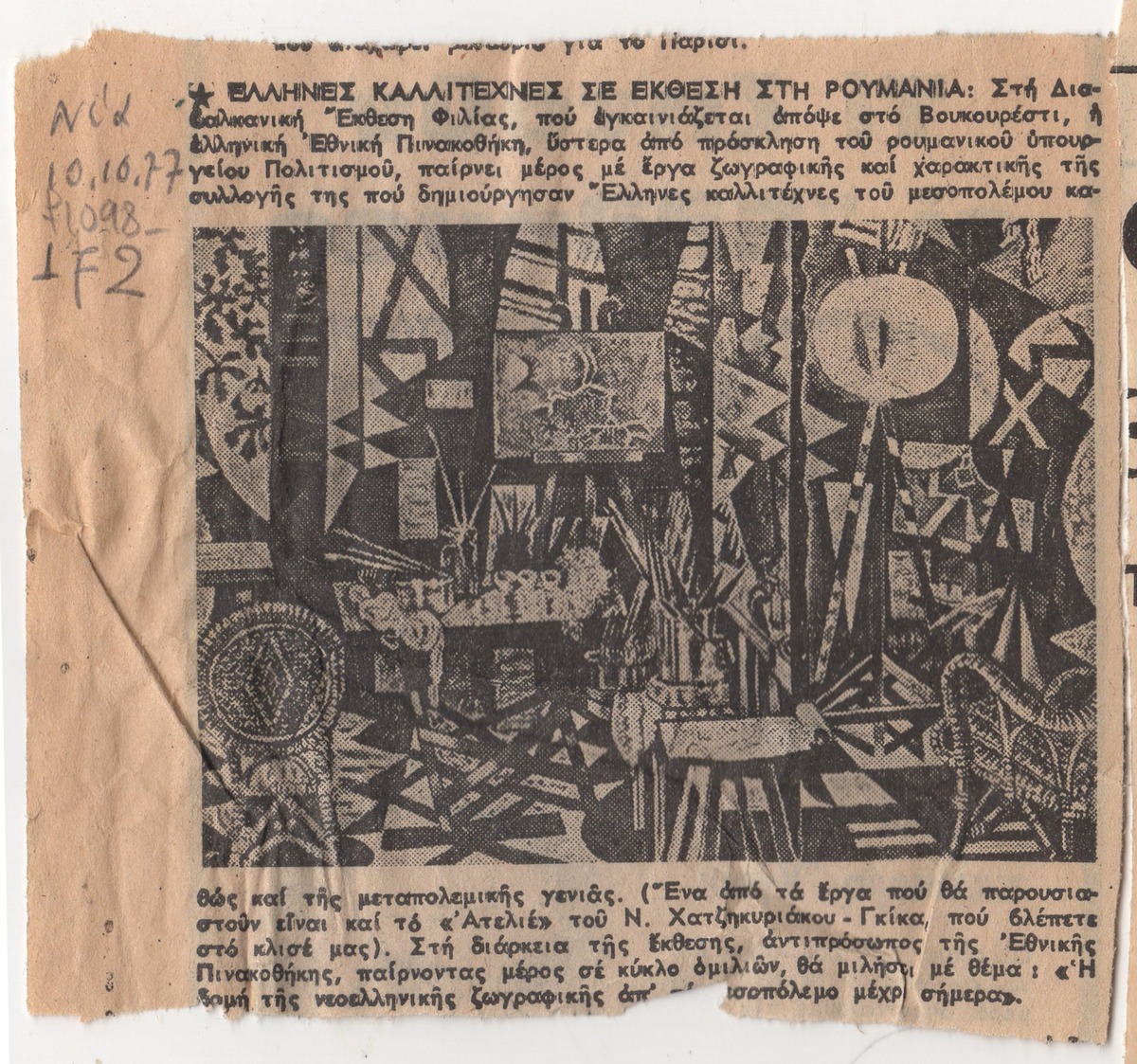 A clipping from the newspaper “Ta Nea”, dated October 10, 1977, featuring an article about the participation of Nikos Chatzikyriakos-Gkikas, in the “Inter-Balkan Friendship Exhibition” in Bucharest.
