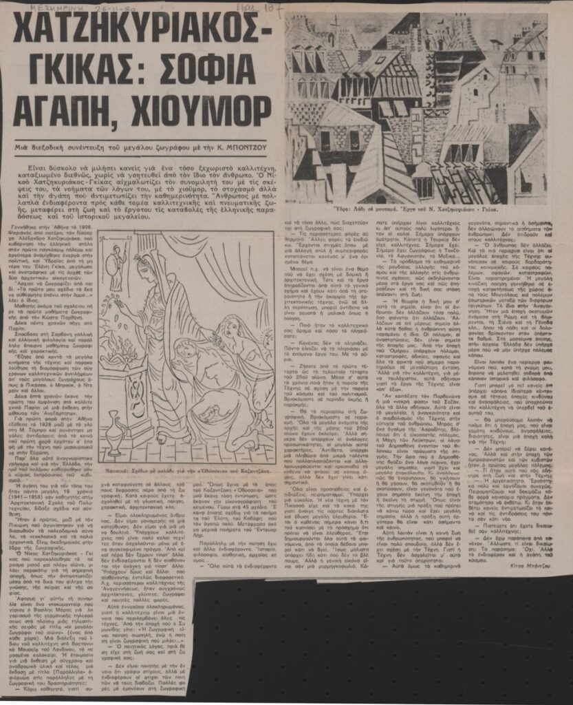 A clipping from the newspaper “Mesimvrini”, dated November 26, 1980, featuring an interview with Nikos Chatzikyriakos-Gkikas, in which he refers to his painting.