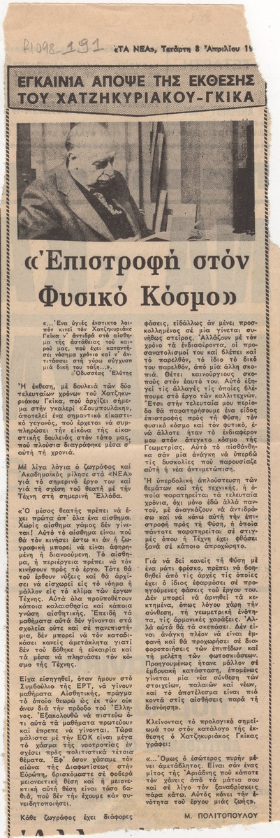 A clipping from the newspaper “Ta Nea”, dated April 8, 1981, featuring an article about the vernissage of Nikos Chatzikyriakos-Gkikas’ exhibition at the Zoumboulakis Gallery in Athens, including excerpts from the artist’s statements.