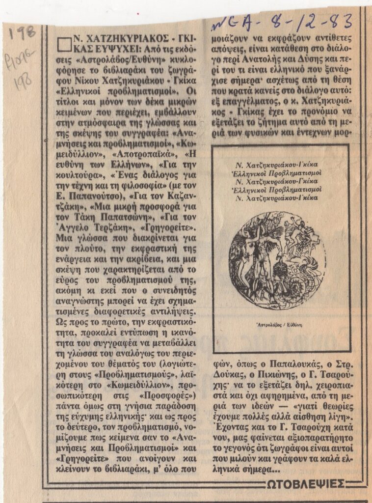 A clipping from the newspaper “Ta Nea”, dated December 12, 1983, featuring an article about a book by the painter Nikos Chatzikyriakos-Gkikas, titled “Hellenic Problems.” The article includes short texts by the artist sharing his thoughts