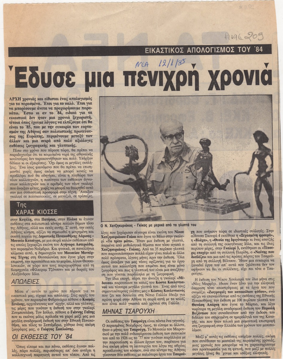 A clipping from the newspaper “Ta Nea”, dated January 12, 1985, featuring an article in the newspaper that provides an overview of significant artistic events in 1984. Among these are the deaths of Kosmas Xenakis, Yannis Gaitis, and Giorgos Sikeliotis. The article also mentions the opening of galleries and exhibition venues in Athens (Kypseli, Plaka, Patisia) and the establishment of a Museum of Modern Art in Thessaloniki. Additionally, it references the development of the Municipal Gallery – Katsigra Museum of Larisa. Important exhibitions by Aginoras Asteriadis, Nikos Chatzikyriakos-Gkikas, Kostas Kouledianos, Yannis Tsarouchis, Nikos Houliaras, Thanasis Apartis, and Periklis Byzantios are highlighted as well.