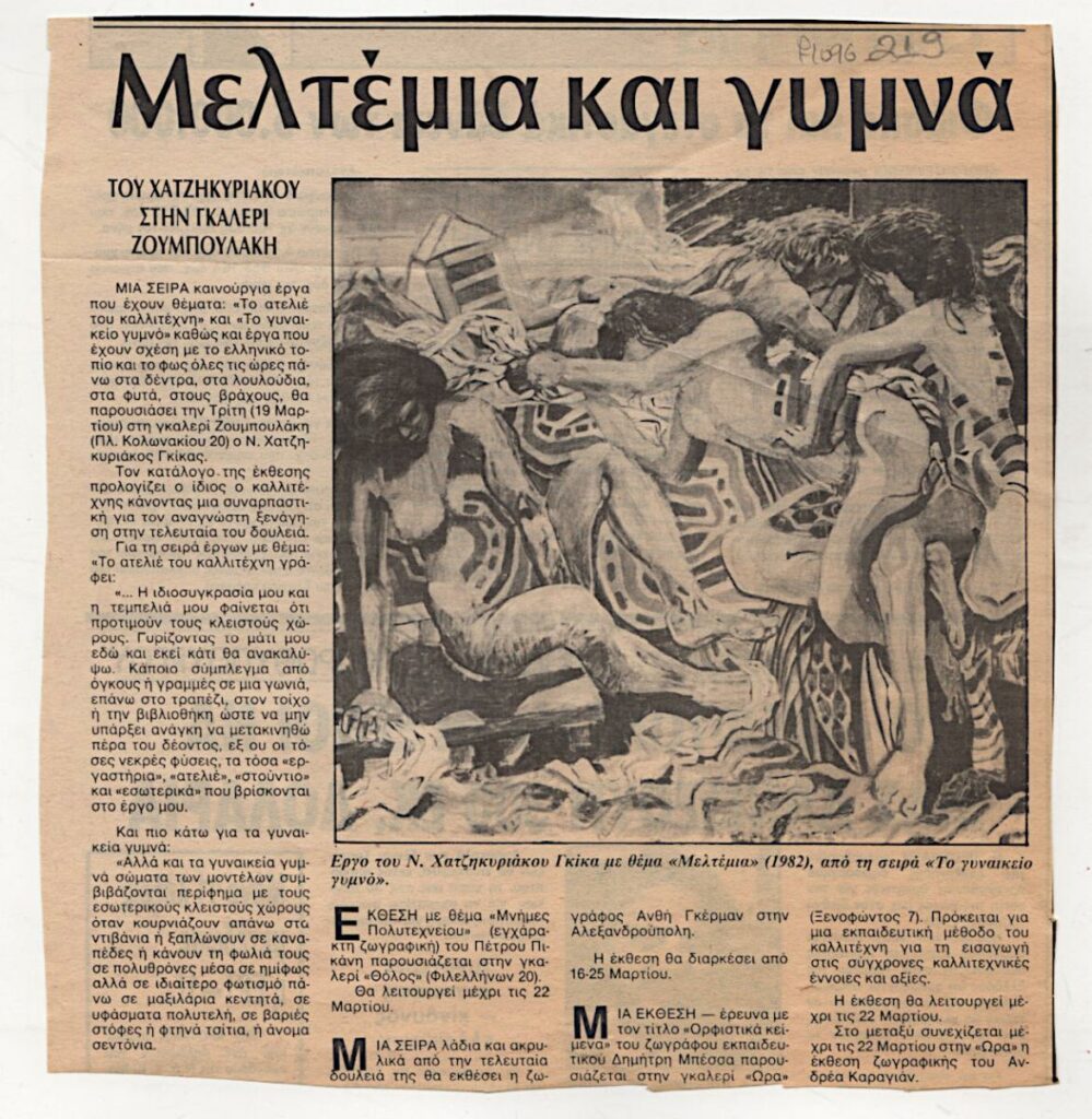A newspaper clipping featuring an article about the exhibition by Nikos Chatzikyriakos-Gkikas at the Zoumboulakis Gallery in Athens. The clipping includes excerpts from the exhibition catalog and also references exhibitions by Petros Pikanis in “Tholos’ Gallery, Anthi German in Alexandroupolis, and by Dimitris Bessas and Andreas Karayan in “Ora” Gallery.