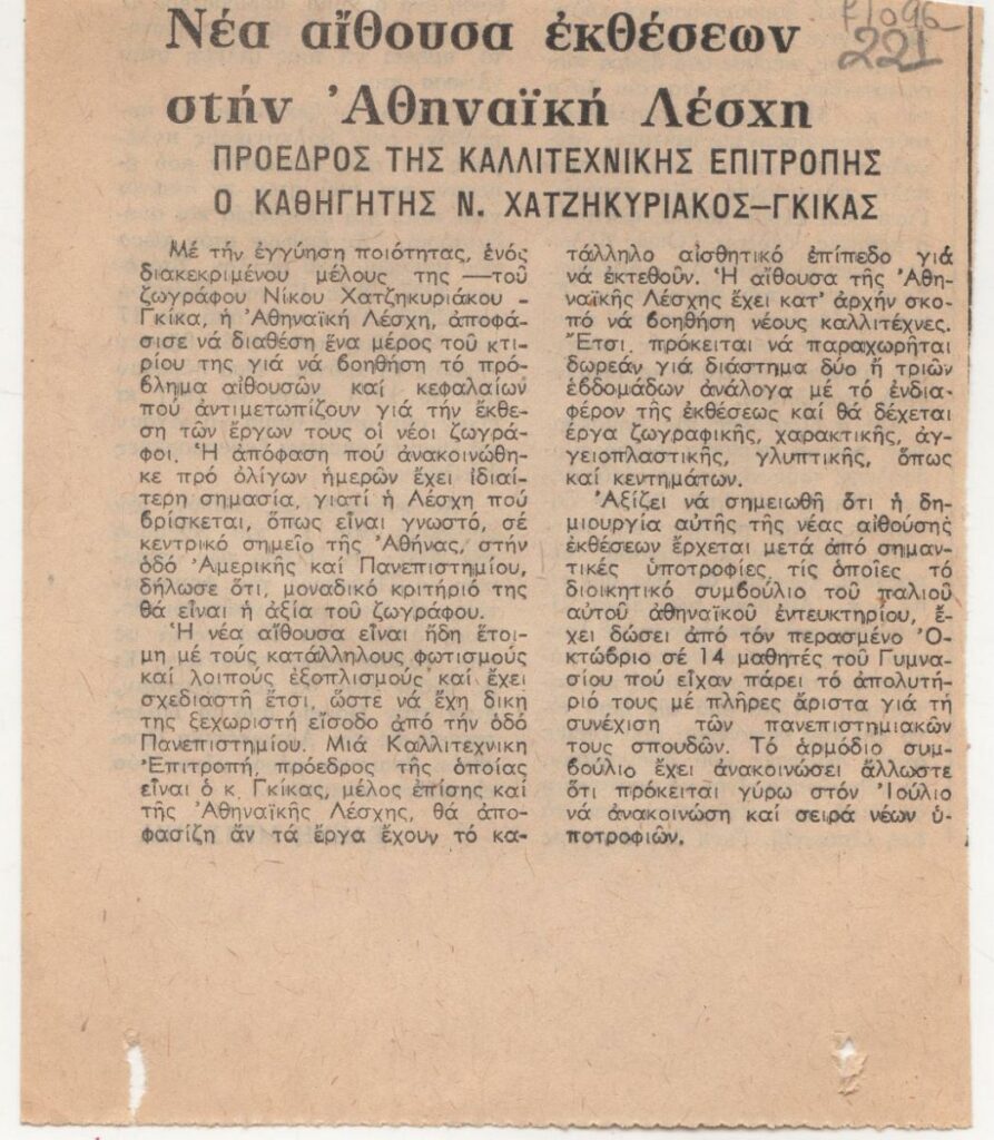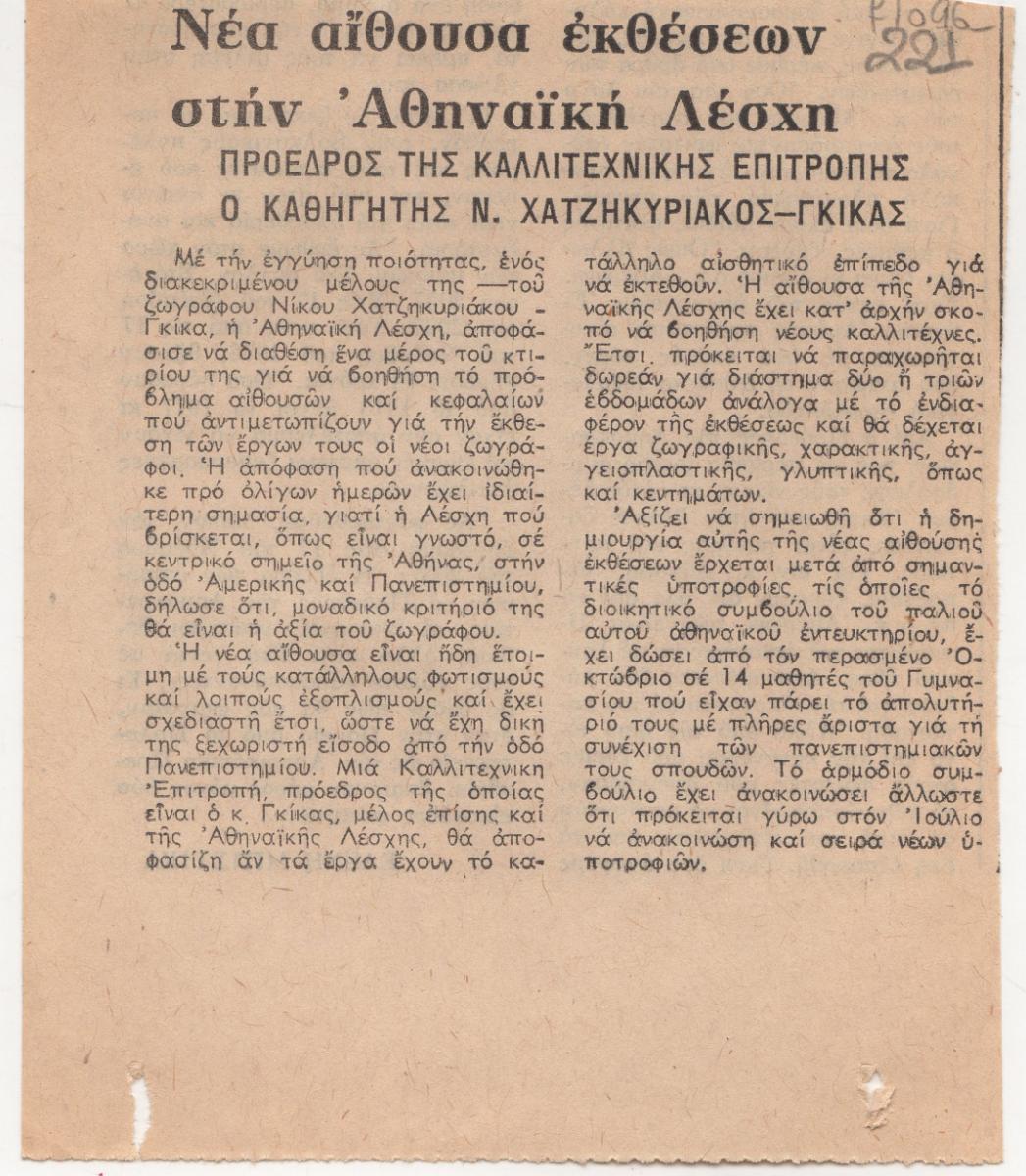 A newspaper clipping, featuring an article about the vernissage of an exhibition at the Athenian Club. President of its artistic committee is Nikos Chatzikyriakos-Gkikas.