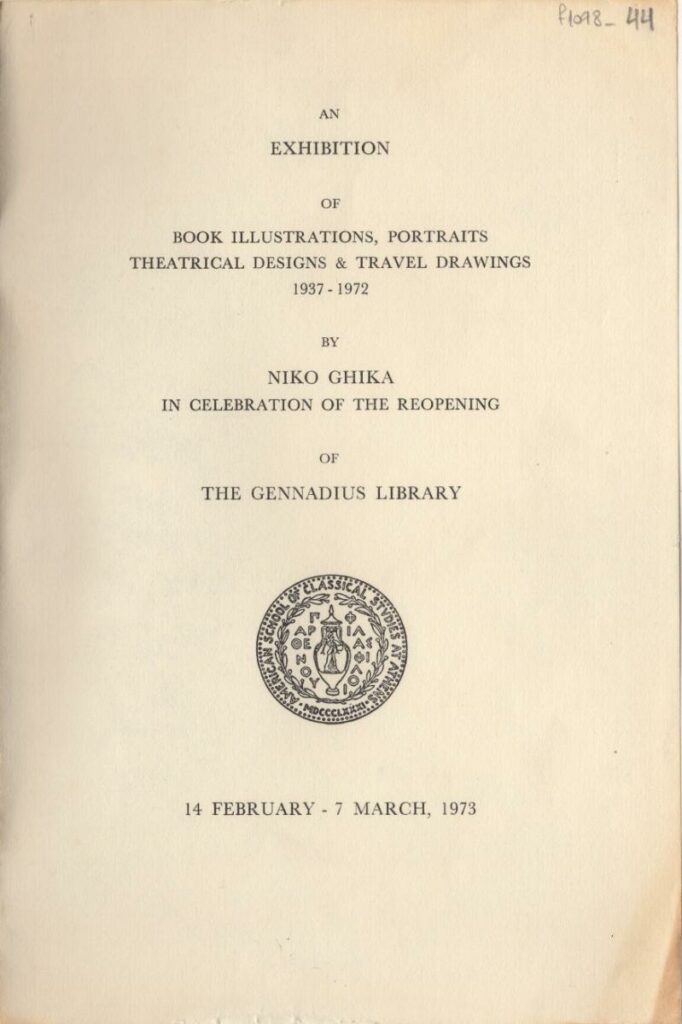 Exhibition catalog of Nikos Hatzikyriakos-Gikas at the Gennadius Library in Athens. The exhibition presents illustrations, portraits, theatrical sketches – stage models, and travel drawings by the artist