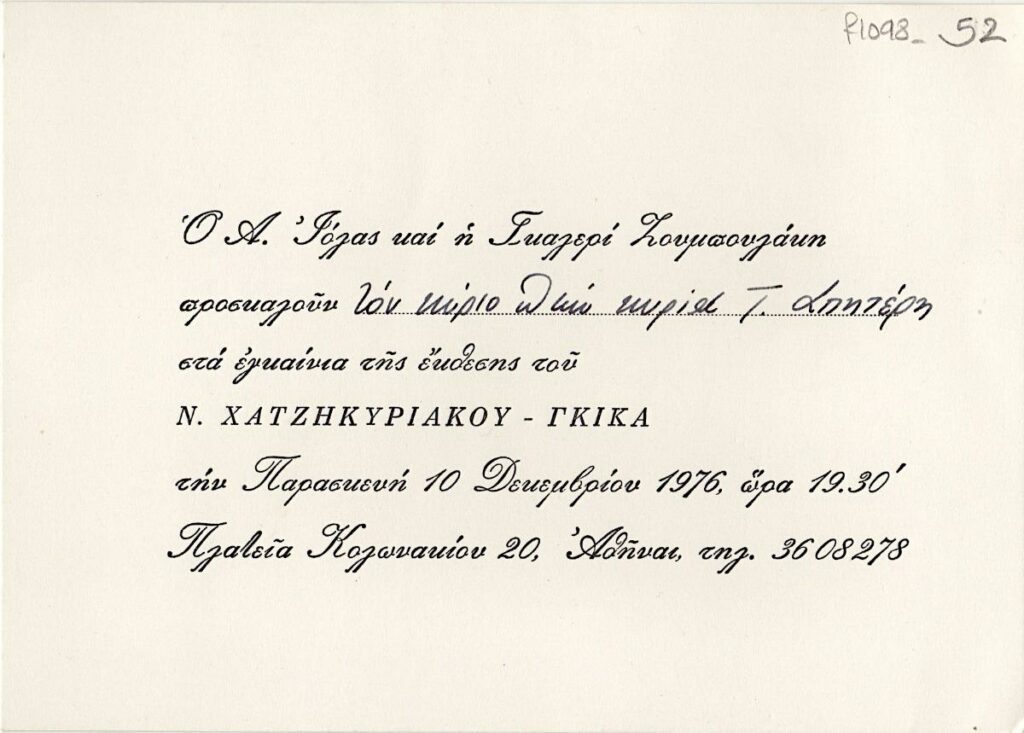 Invitation for the vernissage of an exhbition by Nikos Chatzikyriakos-Gkikas, addressed to Toni and Ioanna Spiteris.