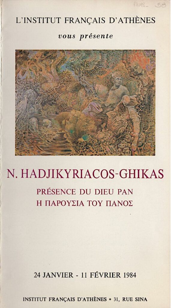 Pamphlet of an exhibition by Nikos Chatzikyriakos-Gkikas, on the subject of the Pan at the Athens French Institute. It contains a biographical note of the artist, texts about his work and theme of the exhibition and illustration.