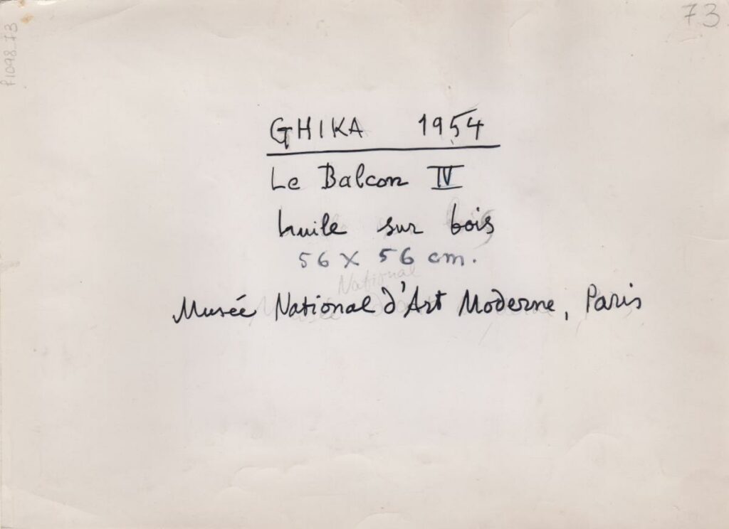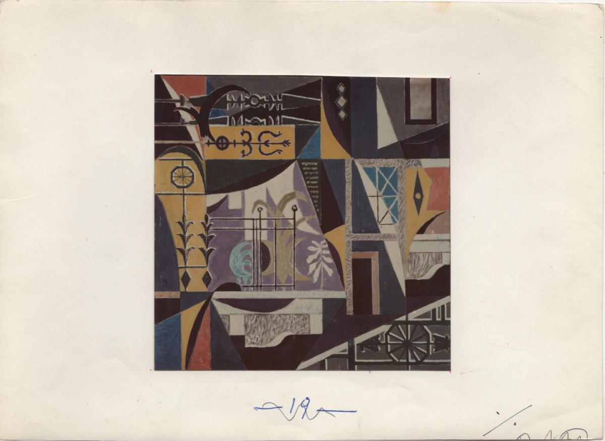 A black-and-white printed photograph of an artwork by Nikos Chatzikyriakos-Gkikas. On the reverse, handwritten insciption.