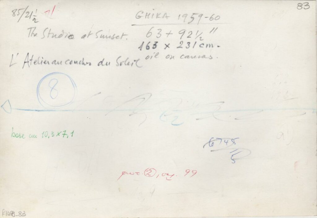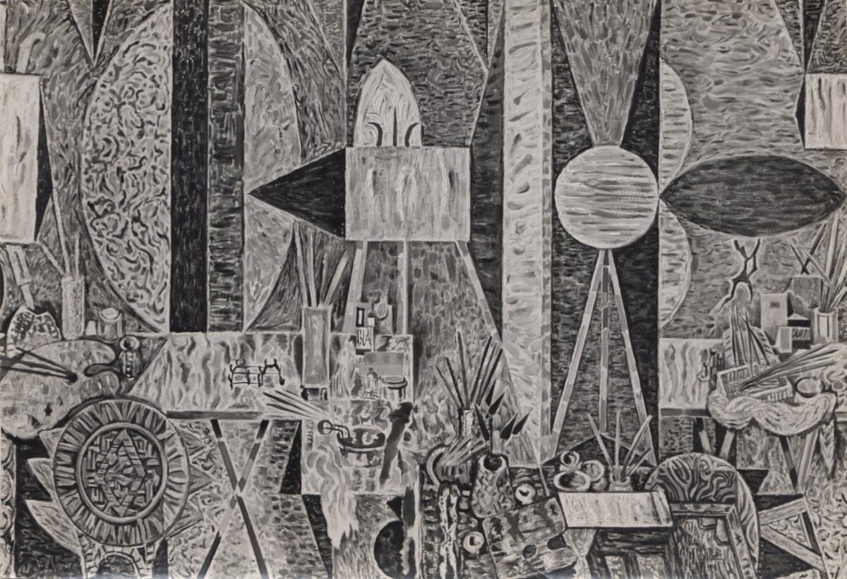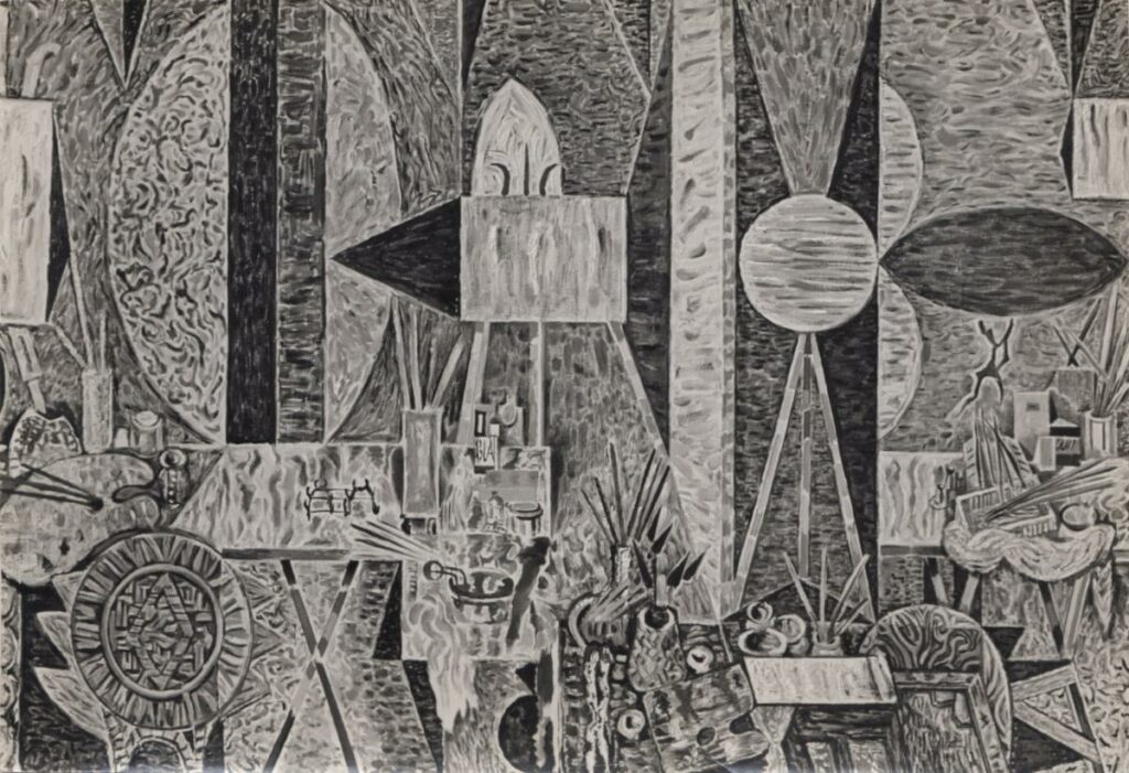 A black-and-white printed photograph of an artwork by Nikos Chatzikyriakos-Gkikas. On the reverse, handwritten insciption.