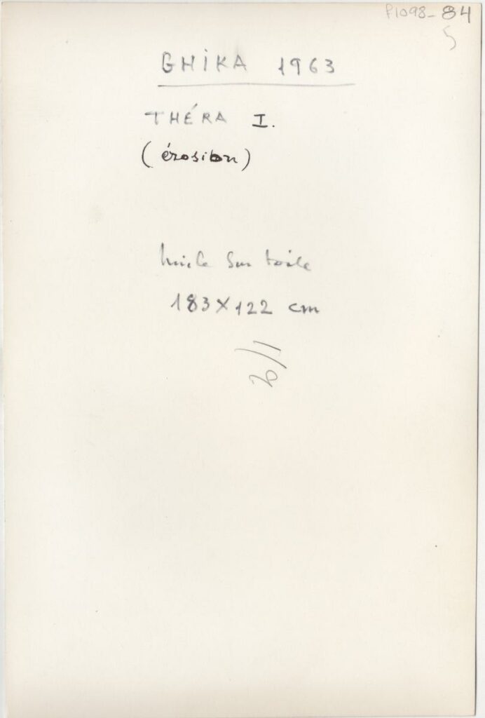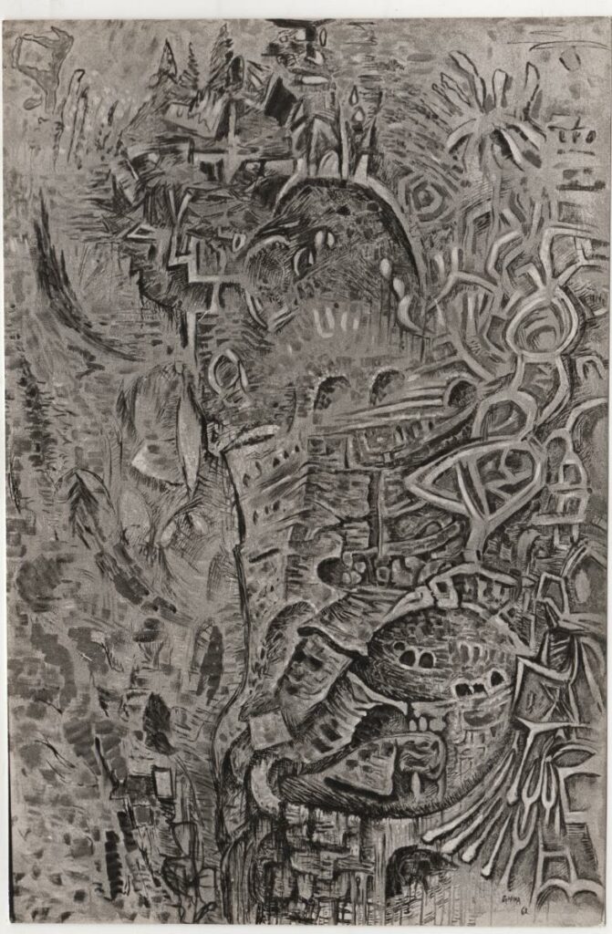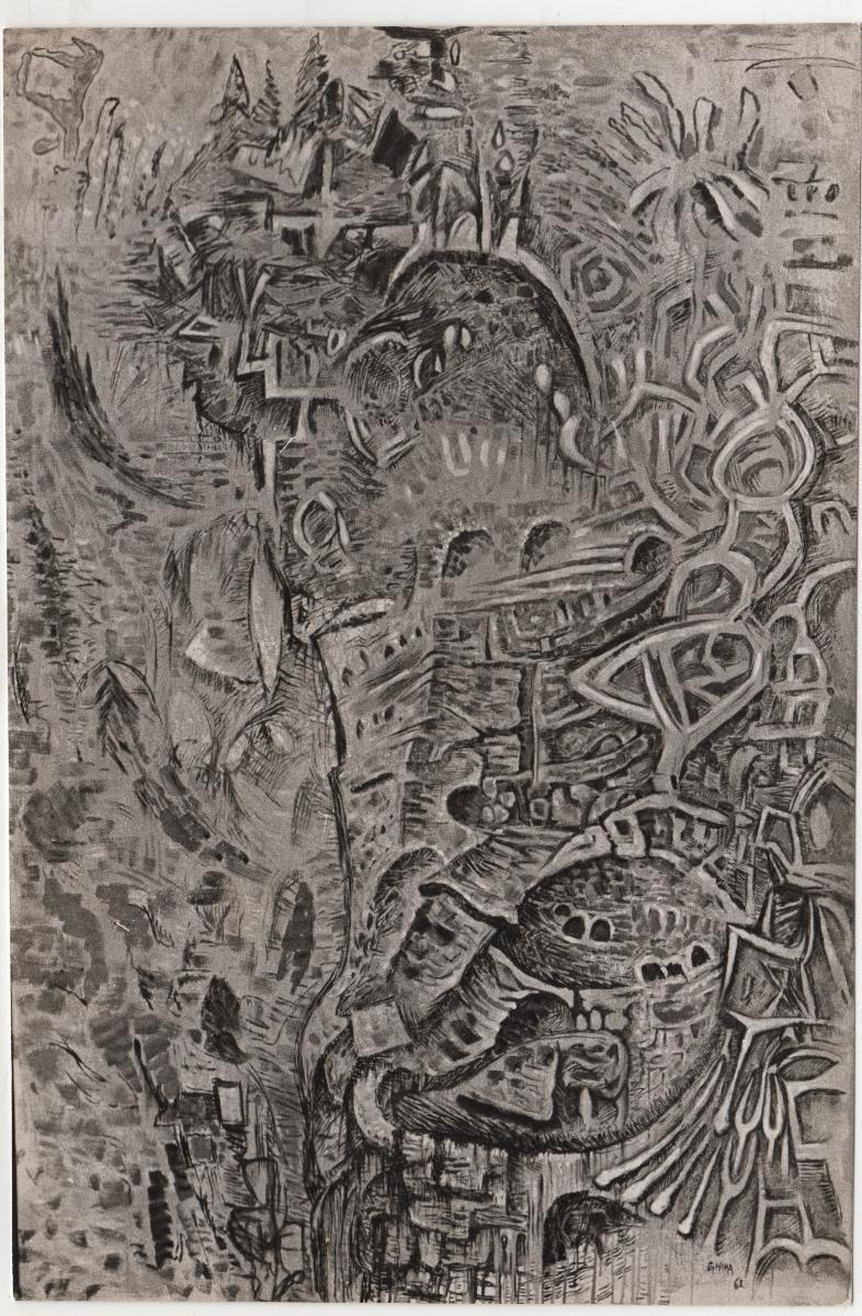 A black-and-white printed photograph of an artwork by Nikos Chatzikyriakos-Gkikas. On the reverse, handwritten insciption.