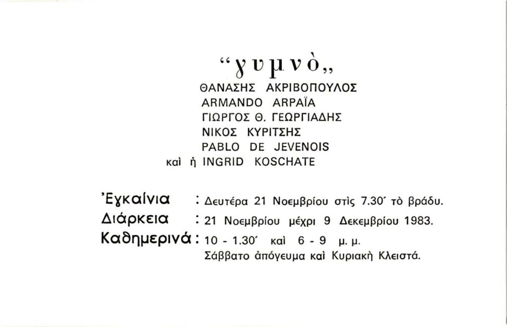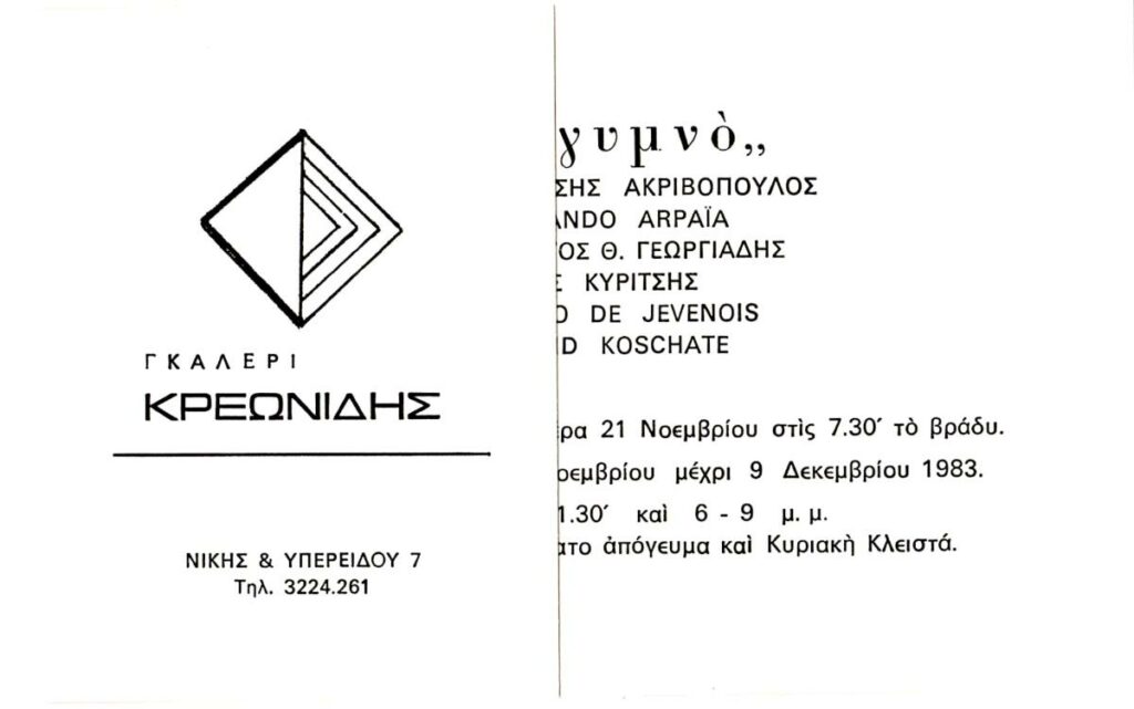 Pentzikis Nikos Gavriil (1908 - 1993) ; Sperantzas Vasilis (1938) ; Kilessopoulos, Apostolos (1942) ; Mavromatis Stellios (1930 - 2020) ; Γιάννης Μενεσίδης (1947) ; Schina Athina ; Eleine Ask ; Κώστας Δομπούλας ; Κάρολος Τσίζεκ (1922 - 2013) ; Georgiadis Giorgos (1933 - 2010) ; Ανέττα Τάσσιου ; Λάζαρος Πάντος ; Ανδρέας Ζαμπέτογλου (1936 - 2006) ; Zoglopitis, Fonis (1930 - 2015) ; Papanakos, Panos-Ioannis (1930 - 1999) ; Μπίλλη Γουσίου (1937 - 1998)