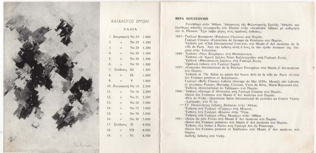 Pamphlet for the solo painting exhibition of Vera Choutzoumni at the “Nees Morfes’ Gallery in Athens in 1961. It includes a biography and a price list of the works.