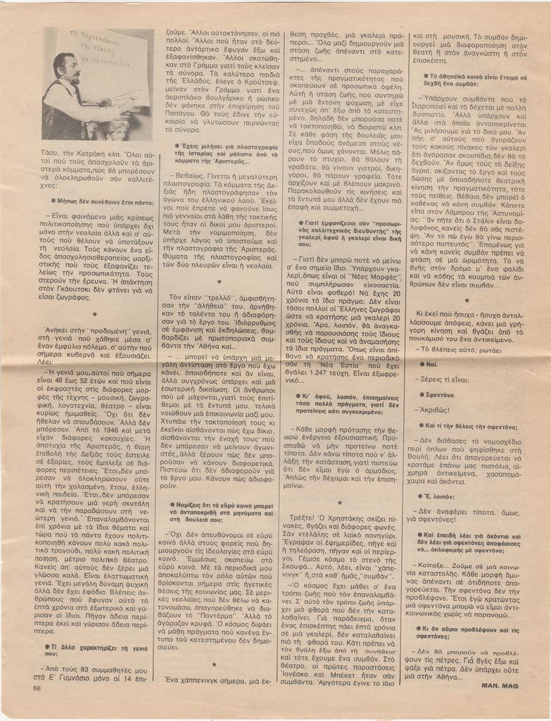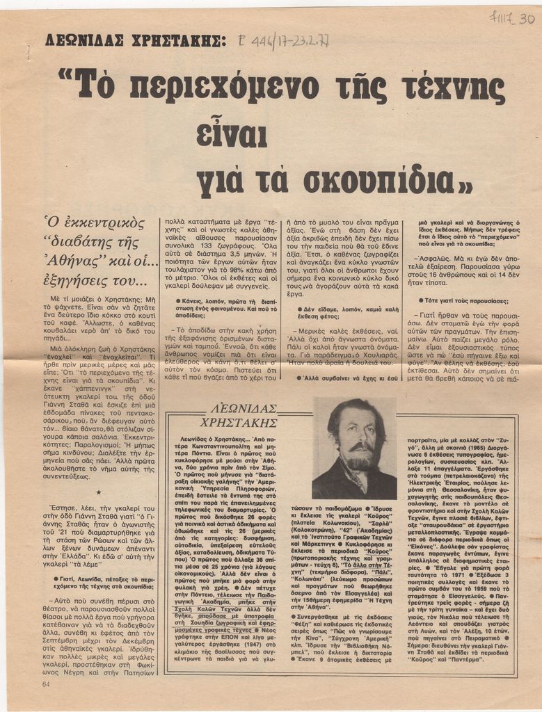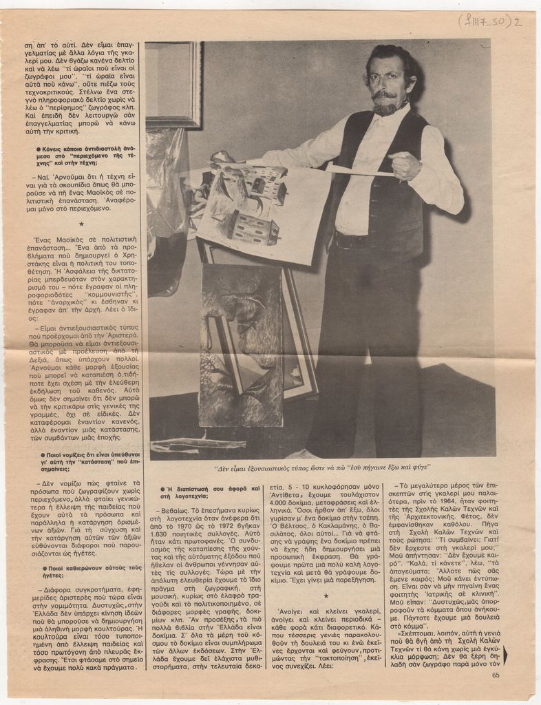 Γεώργιος Σταύρου ; Ηρώ Κωνσταντοπούλου ; Γιάννης Νικολόπουλος ; Theodoros Papagiannis (1942) ; Tsirogiannis Apostolis (1946) ; Vyzantios Periclis (1893 - 1972) ; Ντέπη Φελουκατζή (1941) ; Δημήτρης Κούκος ; Leonidas Christakis (1929 - 2009) ; Christakopoulos Marinos (1946) ; Michalis Georgas (1947) ; Ανδρέας Γκολφινόπουλος ; Zoumpoulis Nikos (1953) ; Samios Pavlos (1948 - 2021) ; Ευάγγελος Κουζούνης ; Απόστολος Μητσάτσος ; Paouris Lazaros (1950) ; Stathis Petropoulos (1944 - 2008) ; Δημήτρης Σακελλίων (1947) ; Giorgos Stathopoulos (1944) ; Liakopoulou Marilena (? - 2016) ; Χρίστος Τζιβέλος ; Marina Vassiloglou-Alevropoulou (1945) ; Λευτέρης Βαλάκας (1944 - 1982) ; Καλλία ; Καραβίτης ; Νίκος Παρασκευάς (1940) ; Νίκος Σημηριώτης ; Κροντήρης ; Κυρτεγος ; Γιώργος Παπαδούκας ; Σταυρακάκη ; Αλέκα Γάτου ; Άλλεν-Ευσταθίου Τζούντιθ (1945) ; Μασονίδης ; Μπαχαρίου ; Γιώργος Χουλιαράς, εικαστικός (1947)