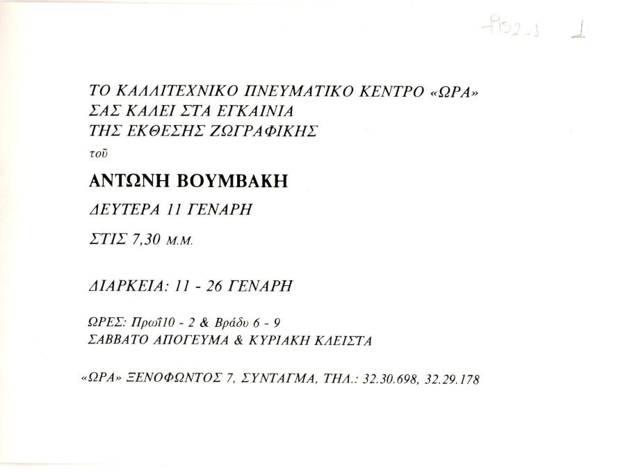 Brochure for the solo exhibition of Antonis Voumvakis at the “Ora” Art and Culture Center in Athens.