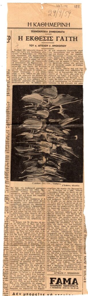 A clipping from the newspaper “I Kathimerini”, dated November 29, 1959, featuring a review of the exhibition by Yannis Gaitis, at the Zygos Gallery in Athens.