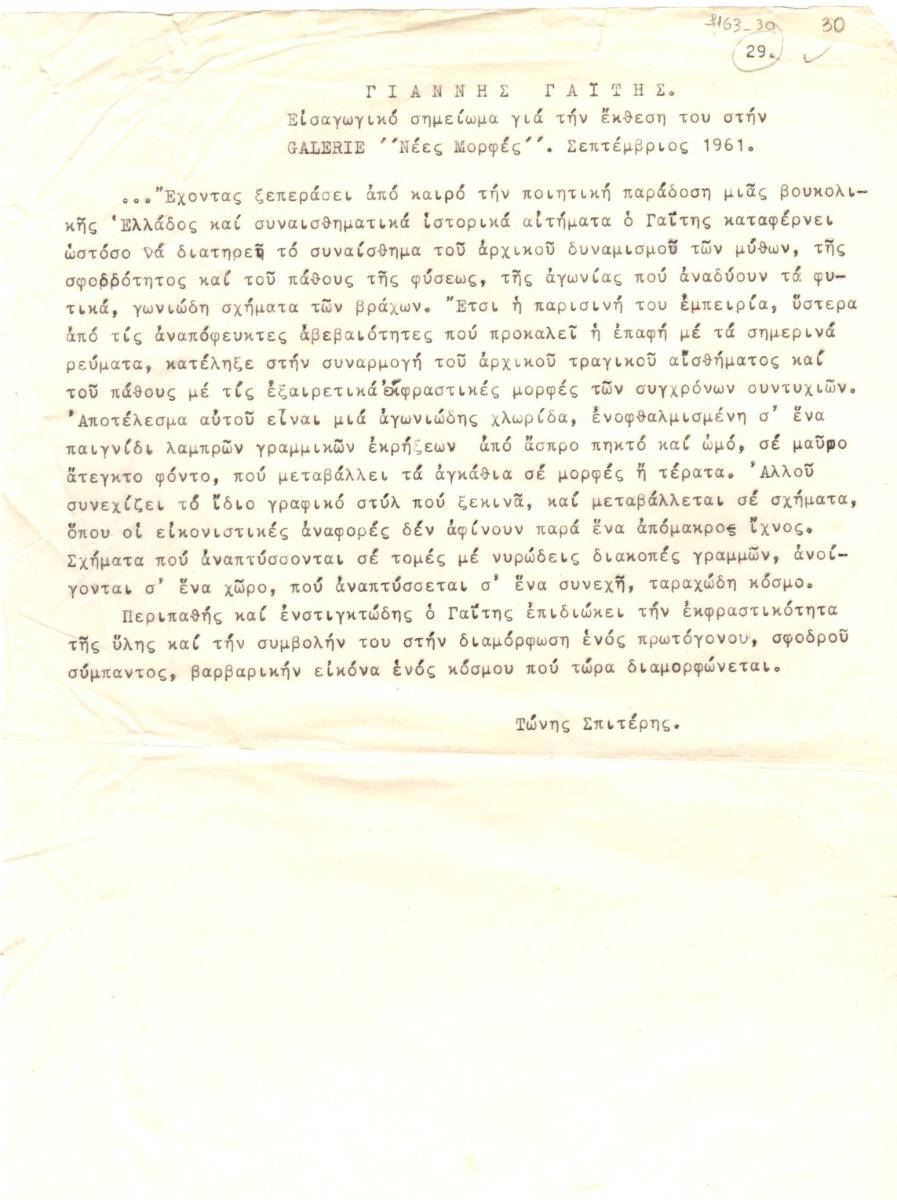 Typewritten version of the introduction by Tonis Spiteris for the solo exhibition by Yannis Gaitis at the Nees Morfes Gallery in Athens.