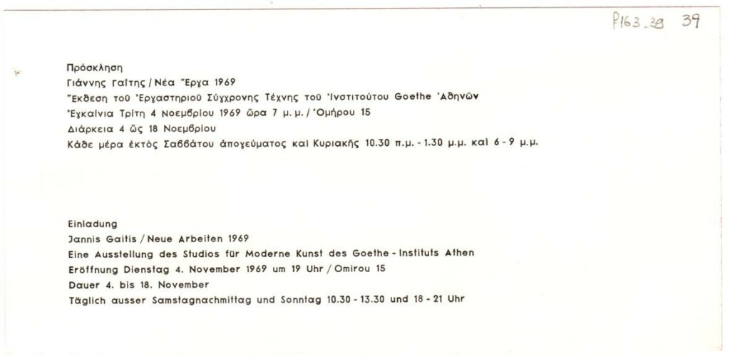 Invitation to the vernissage of a solo exhibition by Yannis Gaitis, at the Goethe Institute in Athens.