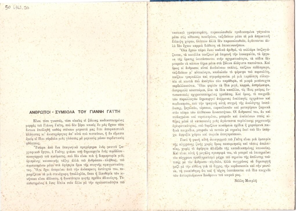 Andreou Kostas (1917 - 2007) ; Spiteris Tonis (1910 - 1986) ; Spiteri-Veropoulou Ioanna (1920 - 2000) ; Kyriakos Rokos (1945) ; Yannis Grammatikopoulos (1928) ; Gaitis Yannis (1923 - 1984) ; Sonia Kalogeropoulou (1945 - 2003) ; Giorgos Vogiatzis (1935 - 1993) ; Christos Sarakatsianos (1937 - 2022) ; Δημήτρης Γραμματικόπουλος