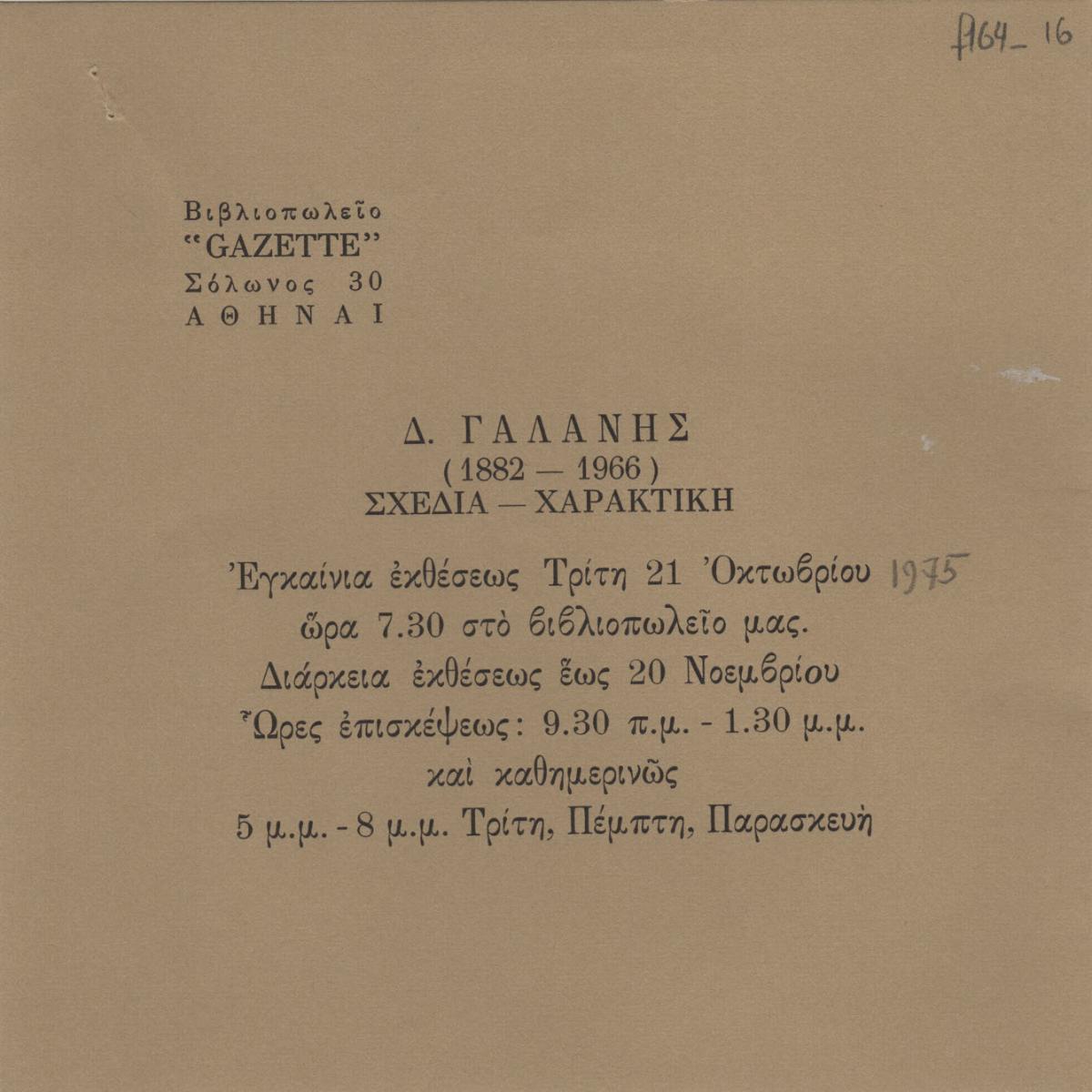 Invitation to the opening of the retrospective exhibition featuring the artist’s drawings and engravings, held in Athens.