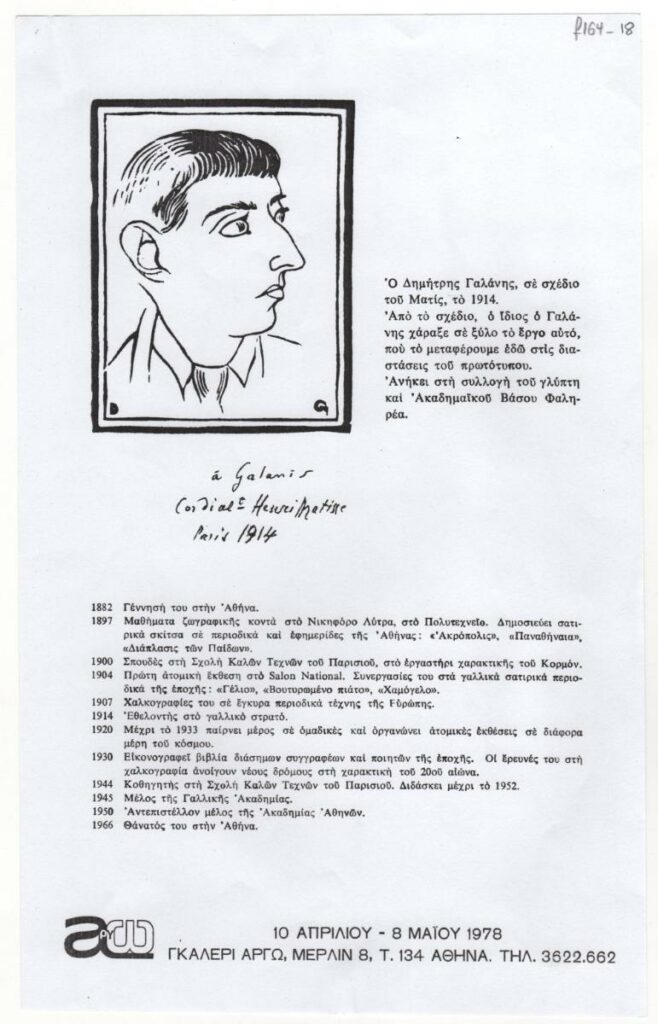 Pamphlet for the artist’s retrospective exhibition of oils, drawings, and etchings, held in Athens. It includes a brief biographical note and a text by academic Vasos Falireas about the artist.