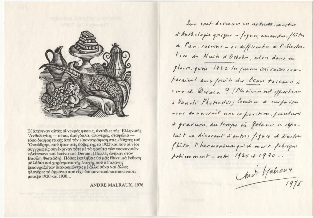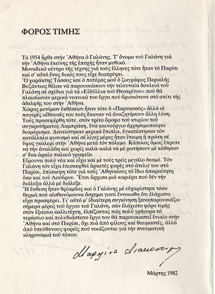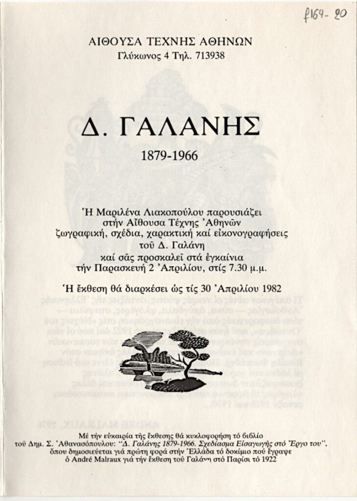 Pamphlet of the retrospective exhibition of Dimitris Galanis, held in Athens. It contains a text by André Marlaux about the artist (manuscript reproduction), as well as text by Marilena Liakopoulou. As part of the exhibition, Dim. S. Athanasopoulos released the book D. Galanis 1879-1966: Introduction Sketch for His Work, which includes a text by Malraux.