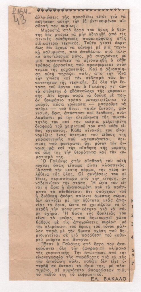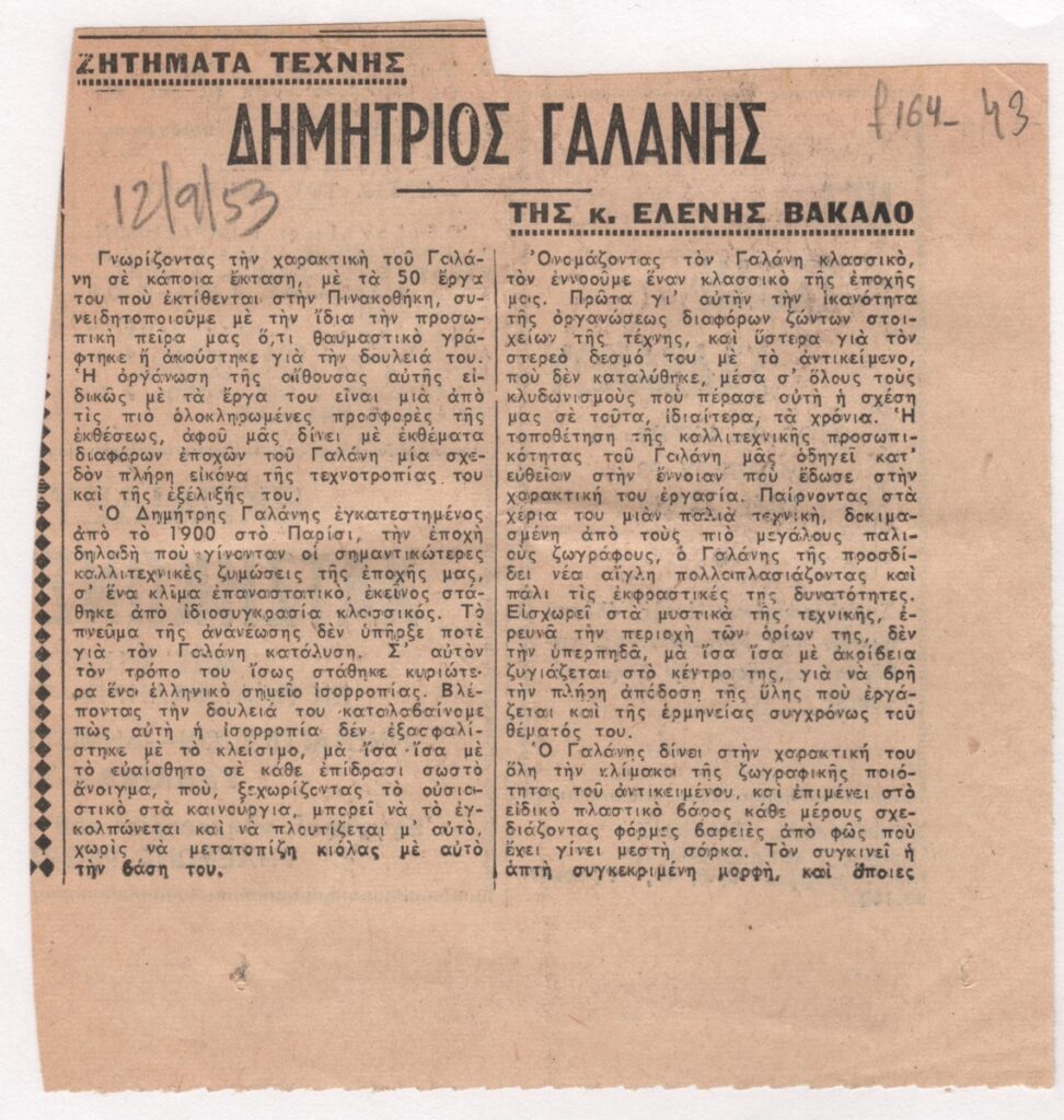Newspaper clipping, dated November 12, 1953, featuring an article about the solo exhibition by Dimitris Galanis in Athens.
