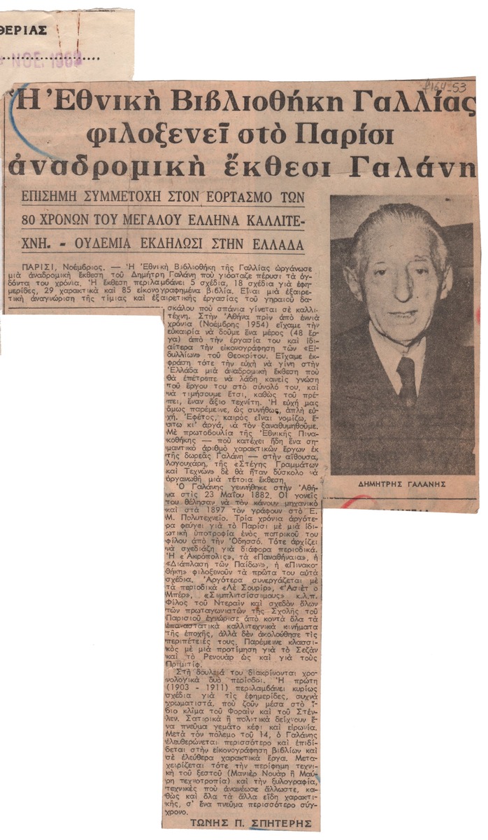 A clipping from the newspaper “Eleftheria”, dated November 14, 1963, featuring an article about the retrospective exhibition of Dimitris Galanis at the Bibliothèque Nationale in Paris to celebrate his 80 years.