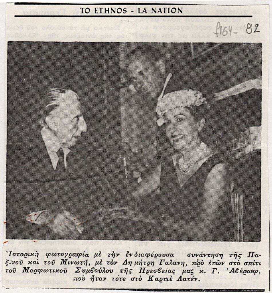 A clipping from the newspaper “To Ethnos – La Nation”, featuring a photo of the Greek engraver Dimitris Galanis with actor A. Minotis and actress K. Paxinou in Paris.