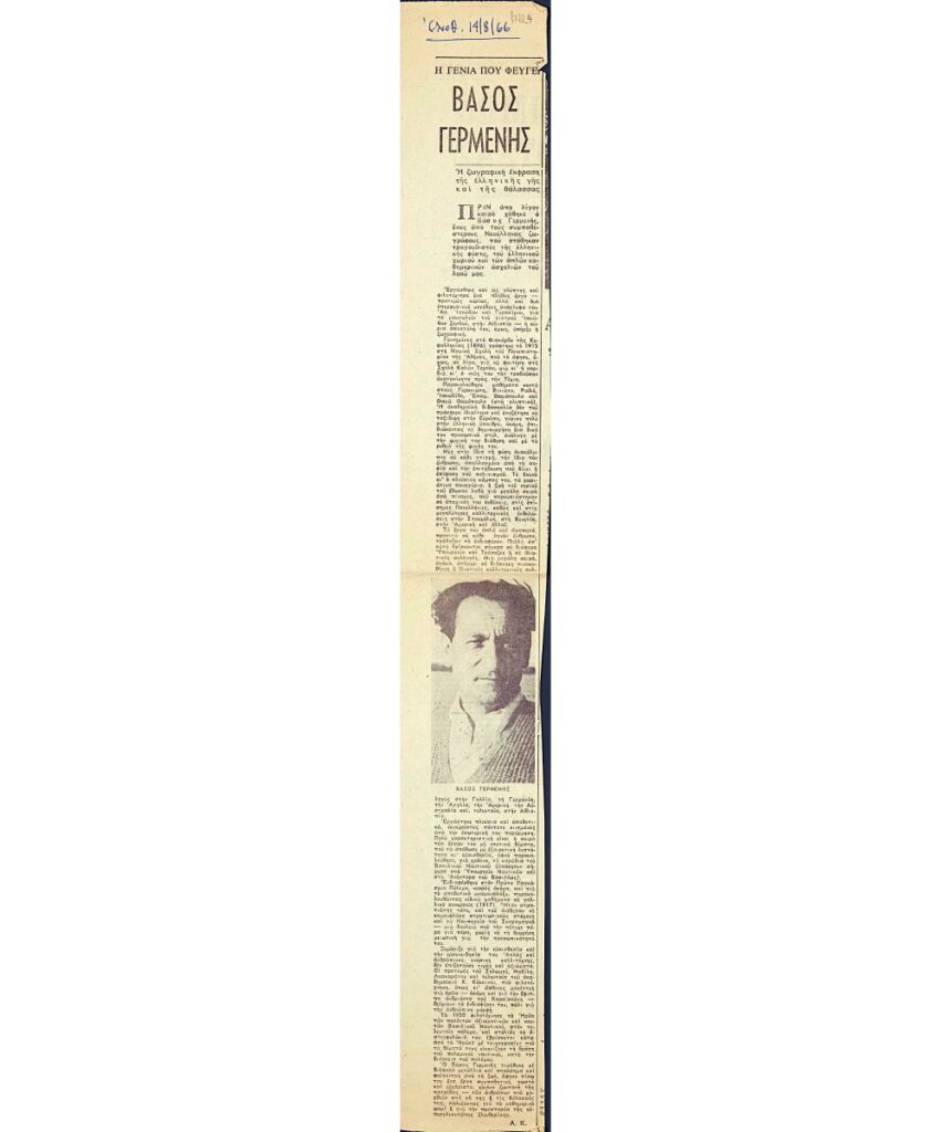A clipping from the newspaper “Eleftheria”, dated August 14, 1966, featuring an article about the artist, giving brief biographical details, studies and work. Illustrated with a photograph of the artist.