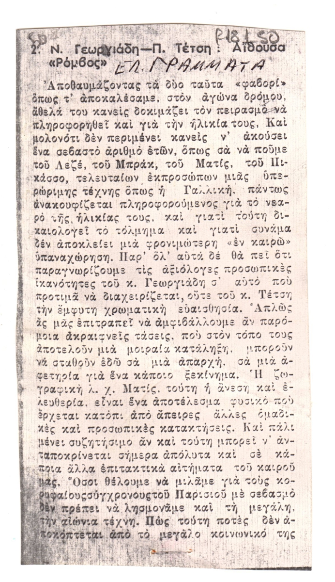 Nikos Engonopoulos (1907 - 1985) ; Semertzidis Valias (1911 - 1983) ; Spiteri-Veropoulou Ioanna (1920 - 2000) ; Vassiliou Spyros (1902 - 1985) ; Hatzikyriakos-Ghika Nikos (1906 - 1994) ; Raftopoulou Bella (1902 - 1992) ; Sikeliotis Giorgos (1917 - 1984) ; Iliopoulou-Rogan Dora (20th century) ; Gaitis Yannis (1923 - 1984) ; Mytaras Dimitris (1934 - 2017) ; Tetsis Panagiotis (1925 - 2016) ; Panayiotis Gravalos (1933 - 2015) ; Konstantinos Grammatopoulos (1916 - 2003) ; Varlamos Giorgos (1922 - 2013) ; Katsoulidis Takis (1933) ; Μάριος Λοβέρδος ; Malamos Kostas (1913) ; Manousakis Giorgos (1914 - 2003) ; Georgios Mavroidis (1912 - 2003) ; Malamou-Mitsea Ioanna (1913 - 2004) ; Preka-Stefanatou Meropi (1934 - 2025) ; Prekas Paris (1926 - 1999) ; Ευάγγελος Τερζόπουλος ; Iris Drakouli (1929)