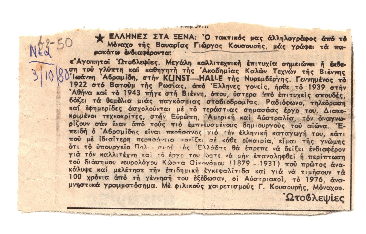 Fatouros Dimitris (1928 - 2020) ; Raftopoulou Bella (1902 - 1992) ; Pavlos (Dionyssopoulos) (1930 - 2019) ; Sachinis Nikos (1924 - 1989) ; Fassianos Alekos (1935 - 2022) ; Tsoclis Costas (1930) ; Christos Kapralos (1909 - 1993) ; Sklavos Yerassimos (1927 - 1967) ; Antonakatou Diana (1922 - 2011) ; Zongopoulos Giorgos (1903 - 2004) ; Achilleas Aperghis (1909 - 1986) ; Mylonas Alex (1923 - 2016) ; Kostas Koulentianos (1918 - 1995) ; Avramidis Ioannis (1922 - 2016) ; Mytaras Dimitris (1934 - 2017) ; Theodoros (Papadimitriou) (1931 - 2018) ; Karas Christos (1930 - 2023) ; Δανιήλ Δανιήλ (1914 - 1988) ; Philolaos (Tloupas) (1923 - 2010) ; Pappas Giannis (1913 - 2005) ; Μαριλένα Κλωνάρη ; Loucopoulos, Clearchos (1906 - 1995) ; Lyberaki Aglaia (1923 - 1985) ; Nikolaidis Giorgos (1924 - 2001) ; Stephopoulos Thanasis (1928 - 2012) ; Γιάννης Κοντός ; Μήτσος Ευθυμιάδης ; Κώστας Κηλαηδόνης (1940) ; Gerda Schmidt-Panknin