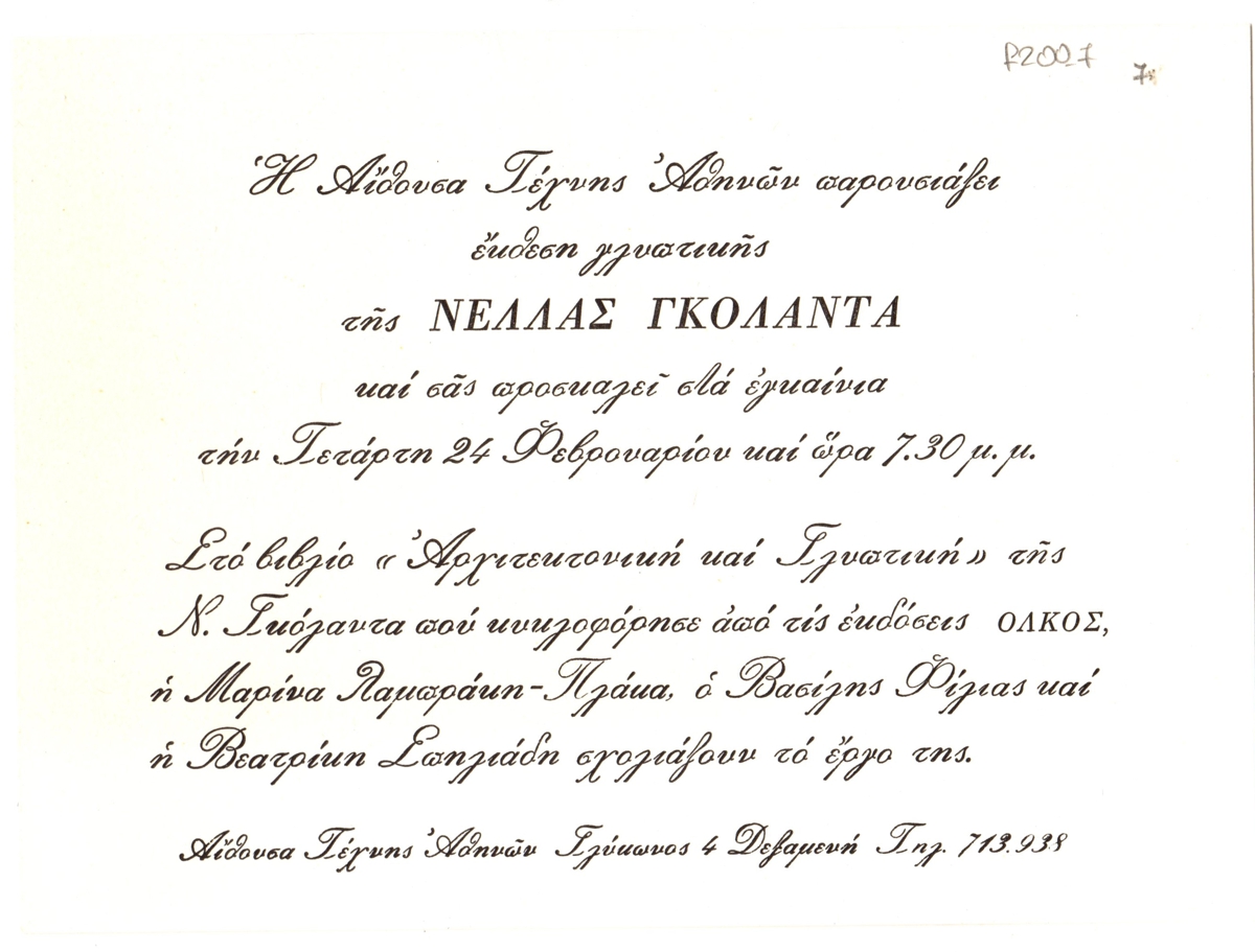 Spiteri-Veropoulou Ioanna (1920 - 2000) ; Xydis Alexandros (1918 - 2004) ; Christou Chrysanthos (1922 - 2016) ; Nella Golanta (1941 - 2023) ; Vasilis Kelaidis (1938) ; Voula Massoura (1936) ; Nikolaidou-Dentrinou Tonia (1927 - 2011) ; Nikolaidis Giorgos (1924 - 2001) ; Νάκης Παναγιωτίδης ; Pastra Nausica (1921 - 2011) ; Michailidou Mary (1940)