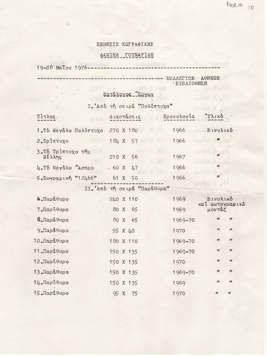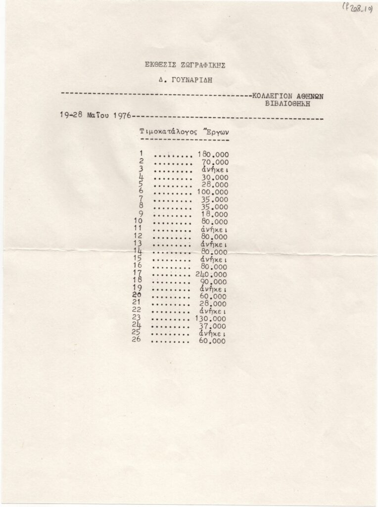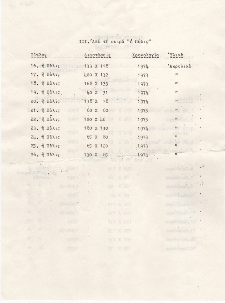 Nikos Engonopoulos (1907 - 1985) ; Gyzis Nikolaos (1842 - 1901) ; Merkouri Melina (1920 - 1994) ; Polymeris Manolis (1951) ; Kazimir Malevich ; Theodoros (Papadimitriou) (1931 - 2018) ; Takis (Vassilakis Panayiotis) (1925 - 2019) ; Bati Olga ; Jacques Lang ; Γιάννης Κουνέλλης (1936 - 2017) ; Daniel Gounaridis (1934) ; Vasilis Kelaidis (1938) ; Lytras Nikiforos (1832 - 1904) ; Patrikalakis Faidon (1935 - 2017) ; Νικόλας Λάσκαρης (1947) ; Μαρία Βασιλάκη (1957) ; Σταύρος Μιχαλαριάς ; Κάρολος Καμπελόπουλος ; Κλέων Βουτυράς