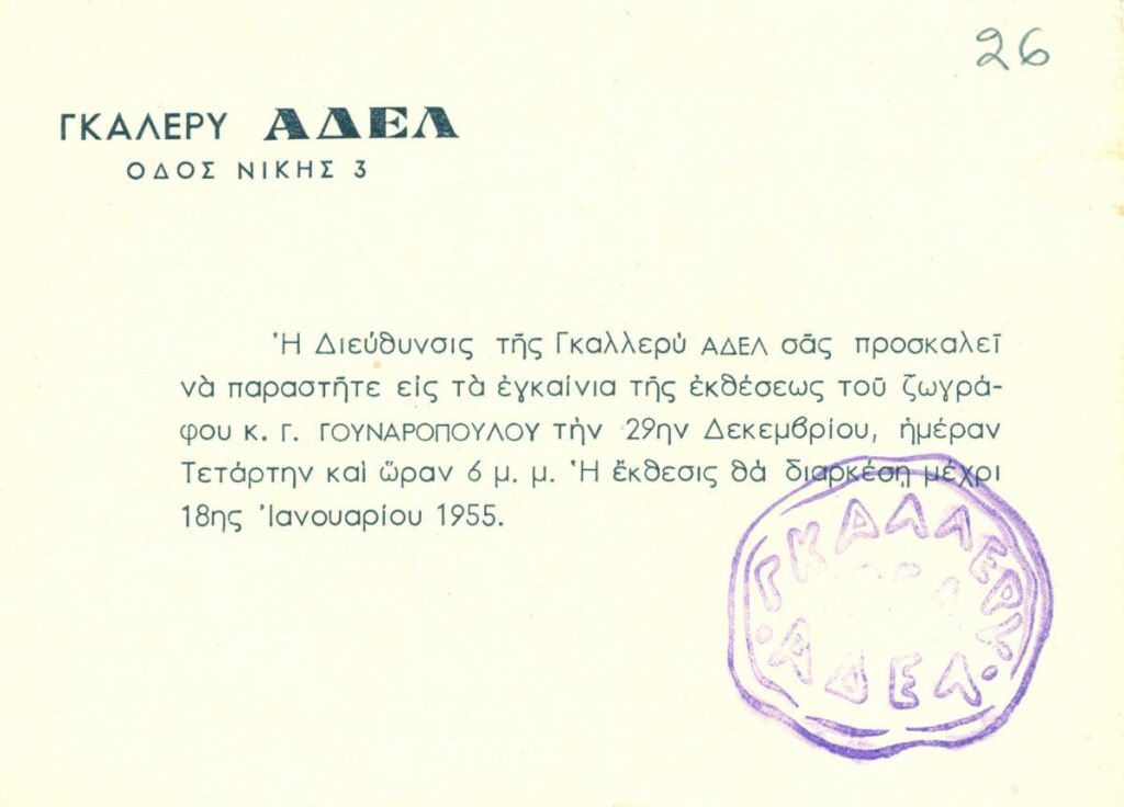 Invitation to an exhibition by Giorgios Gounaropoulos in Athens.