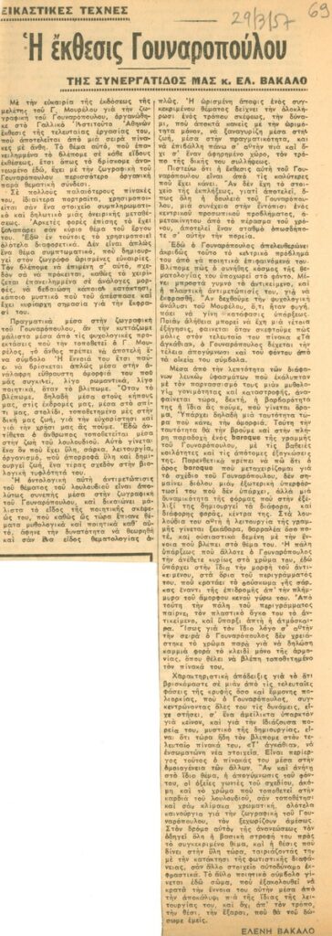 A newspaper clipping, dated March 29, 1957, featuring a review of the artist’s exhibition in Athens.