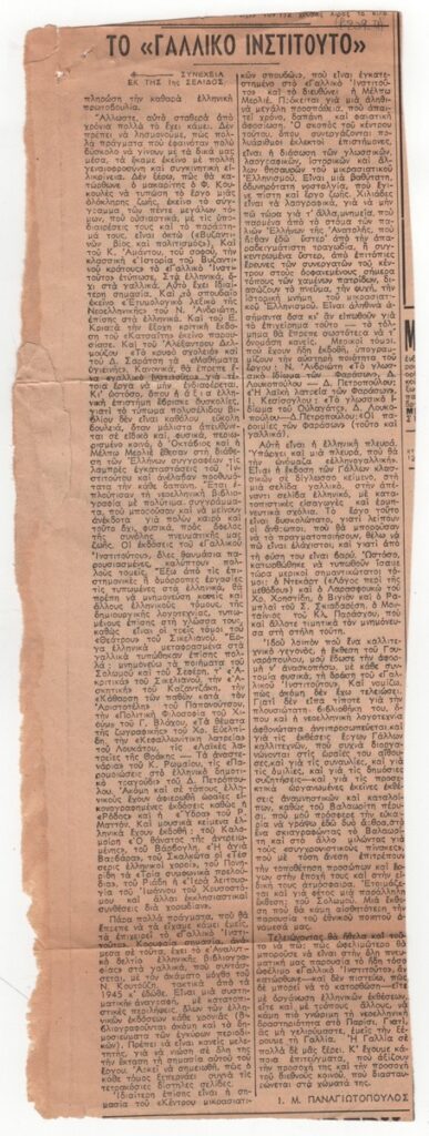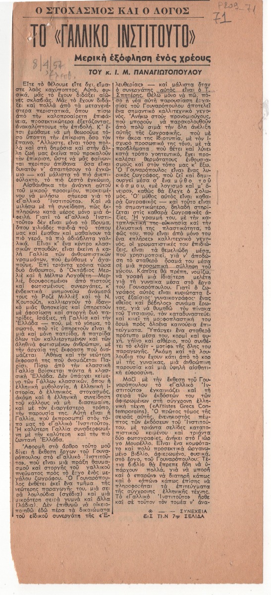 A clipping from the newspaper “Eleftheria”, dated April 8, 1957, featuring an article on the activities of the French Institute, marking the organization of an exhibition by G. Gounaropoulos in their exhibition venue and the publication of G. Vakalo’s study on the artist.