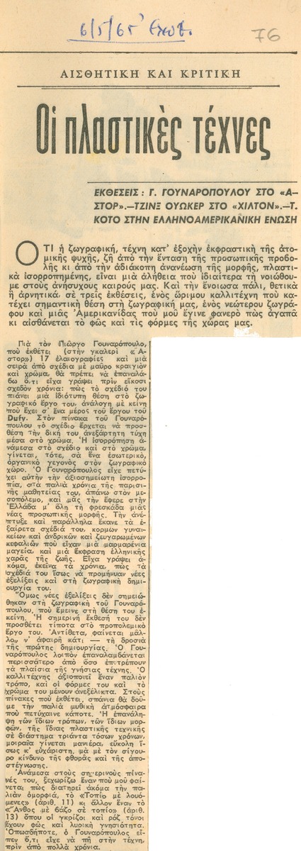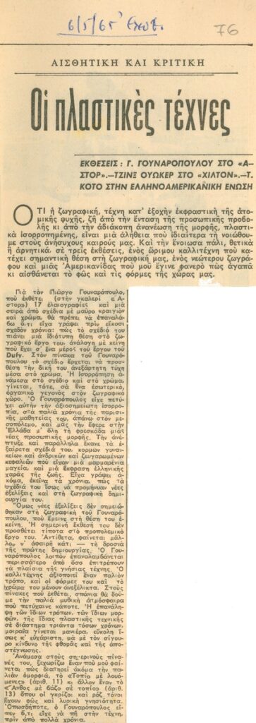 A clipping from the newspaper “Eleftheria”, dated May 6, 1965, featuring a review of the solo exhibition by G. Gounaropoulos in Athens.