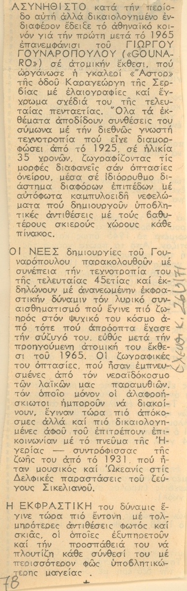 A clipping from the newspaper “Eleftheria”, dated February 23, 1970, featuring an article about artist’s first solo exhibition in Athens after 1965.