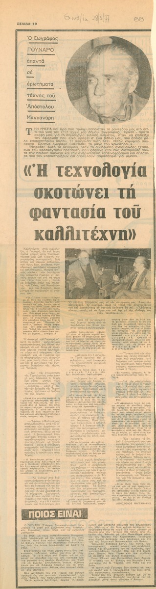 A clipping from the newspaper “Eleftheros Cosmos”, dated May 28, 1977, featuring an interview with the Greek painter Giorgos Gounaropoulos about art, inspiration and the role of technology.