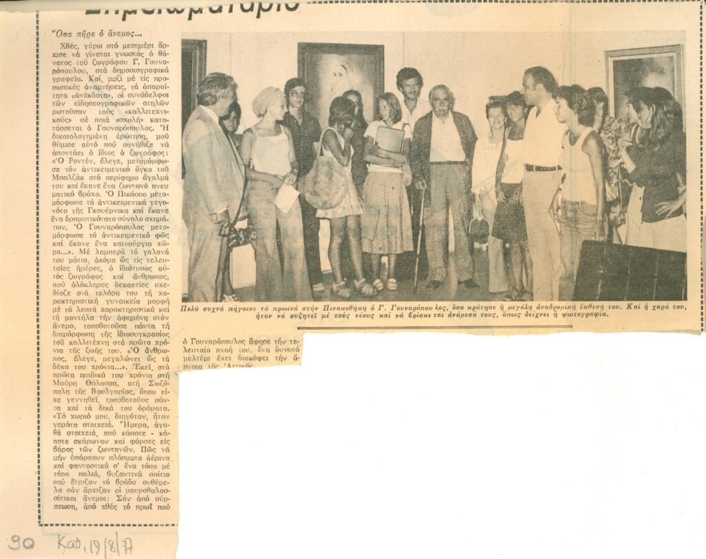 A clipping from the newspaper “I Kathimerini”, dated August 19, 1977, featuring an article about the artist on the occasion of his passing. Illustrated with a photograph from his recent exhibition.