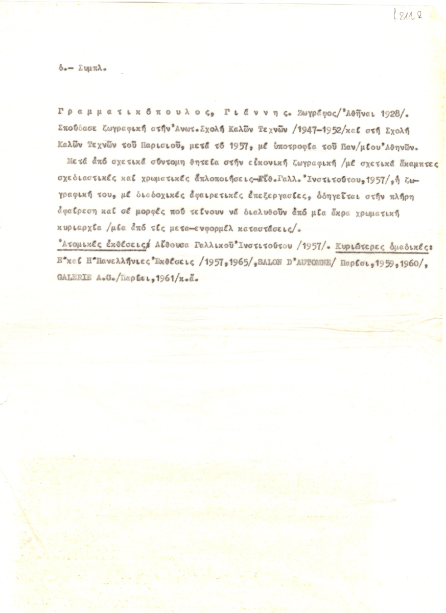 Spiteri-Veropoulou Ioanna (1920 - 2000) ; Moralis Yannis (1916 - 2009) ; Yannis Grammatikopoulos (1928) ; Christina Zervou (1937 - 1988) ; Mytaras Dimitris (1934 - 2017) ; Theodoros (Papadimitriou) (1931 - 2018) ; Karas Christos (1930 - 2023) ; Victor Vasarely ; Achilleas Droungas (1940) ; Τρύφων Καζάκος (1895 - 1966)
