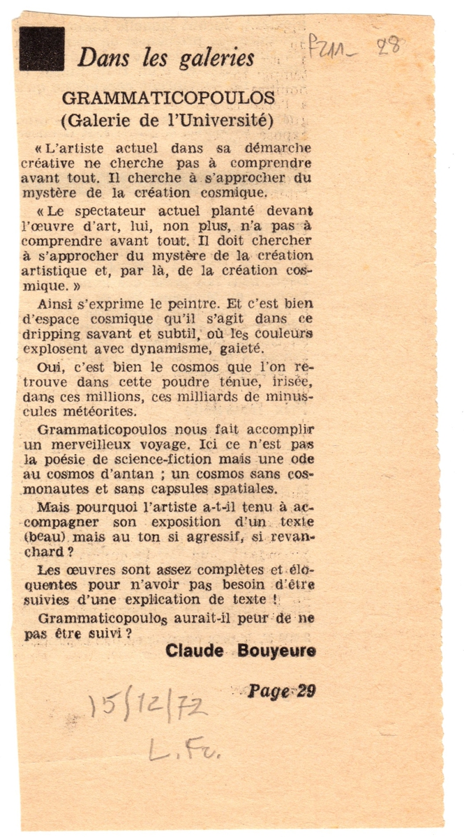 Spiteri-Veropoulou Ioanna (1920 - 2000) ; Moralis Giannis (1916 - 2009) ; Grammatikopoulos Konstantinos (1928) ; Zervou Christina (1937 - 1988) ; Mytaras Dimitris (1934 - 2017) ; Papadimitriou Theodoros (1931 - 2018) ; Karras Christos (1930 - 2023) ; Victor Vasarely ; Droungas Achilles (1940) ; Τρύφων Καζάκος (1895 - 1966)