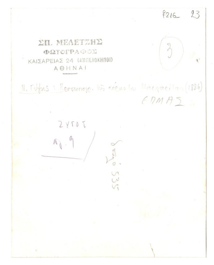Black-and-white printed photograph of an art work by Nikolaos Gyzis. On the reverse, inscriptions.