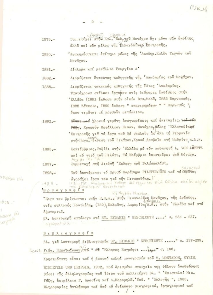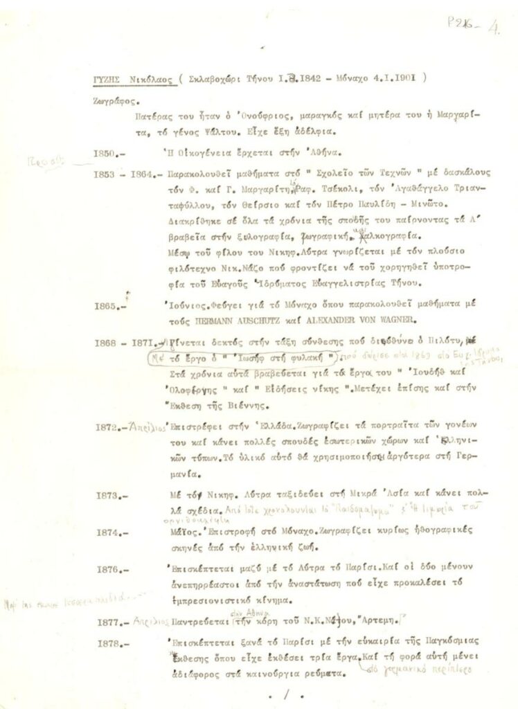 A typewritten text containing biographical information about the painter Nikolaos Gyzis. It presents the most important events of his life and career in chronological order, along with a list of his works and bibliographic references.
