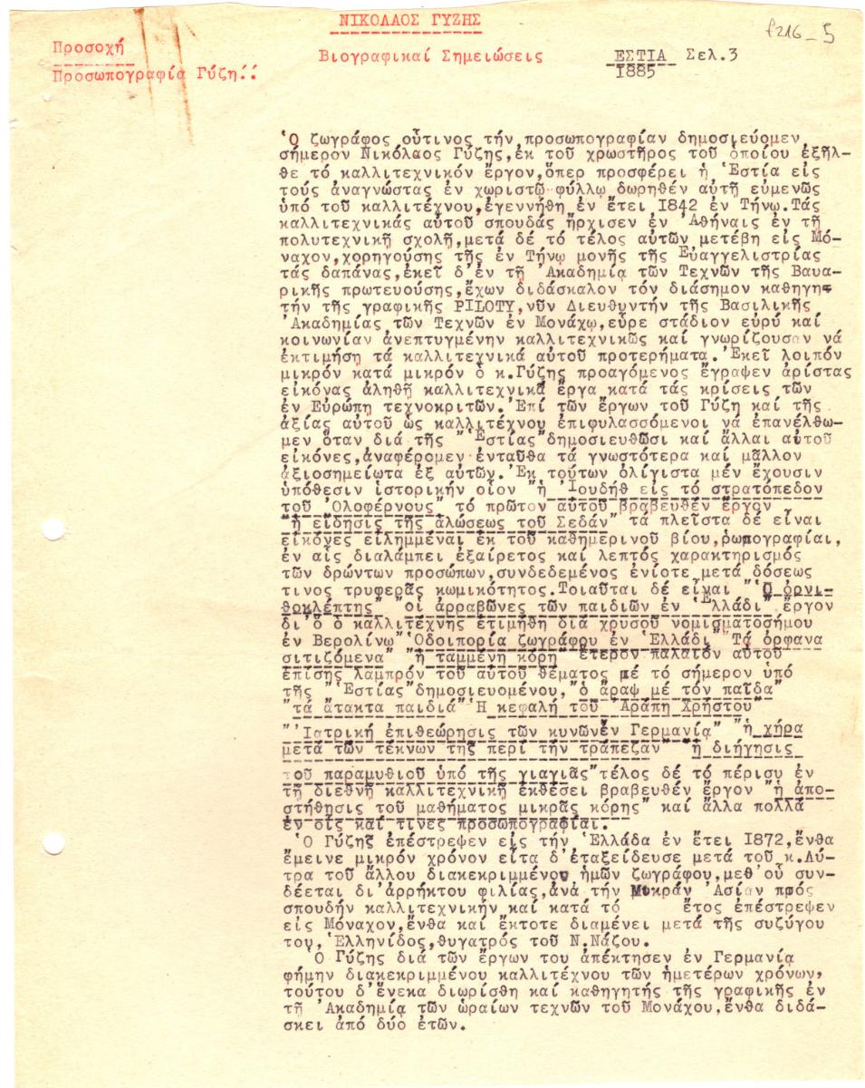 Handwritten transcription of a publication about Nikolaos Gyzis, sourced from the magazing “Estia”.