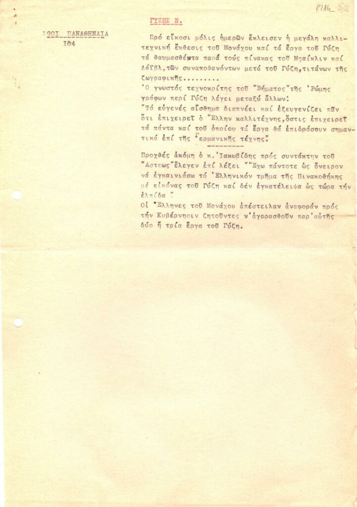 A handwritten transcription of a publication about Nikolaos Gyzis, sourced from a 1901 issue of the magazine “Panathenea”.