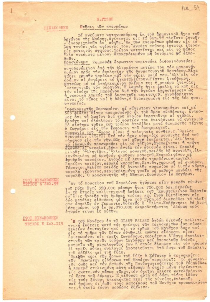 Handwritten transcription of a publication about Nikolaos Gyzis, sourced from issues of the magazine “Pinakothiki” published from 1901 to 1905.