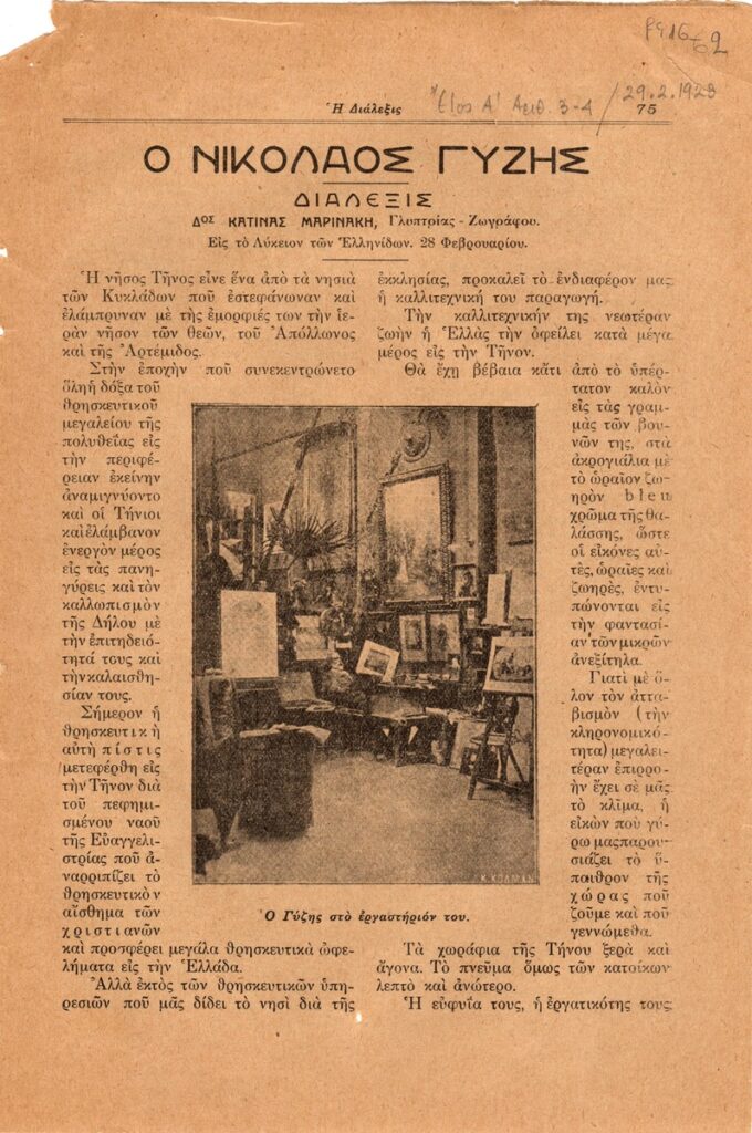 A magazine clipping, dated February 29, 1928 featuring the publication of a lecture on the life and work of the Greek artist Nikolaos Gyzis delivered by Katina Marinakis at the Hellenic High School.