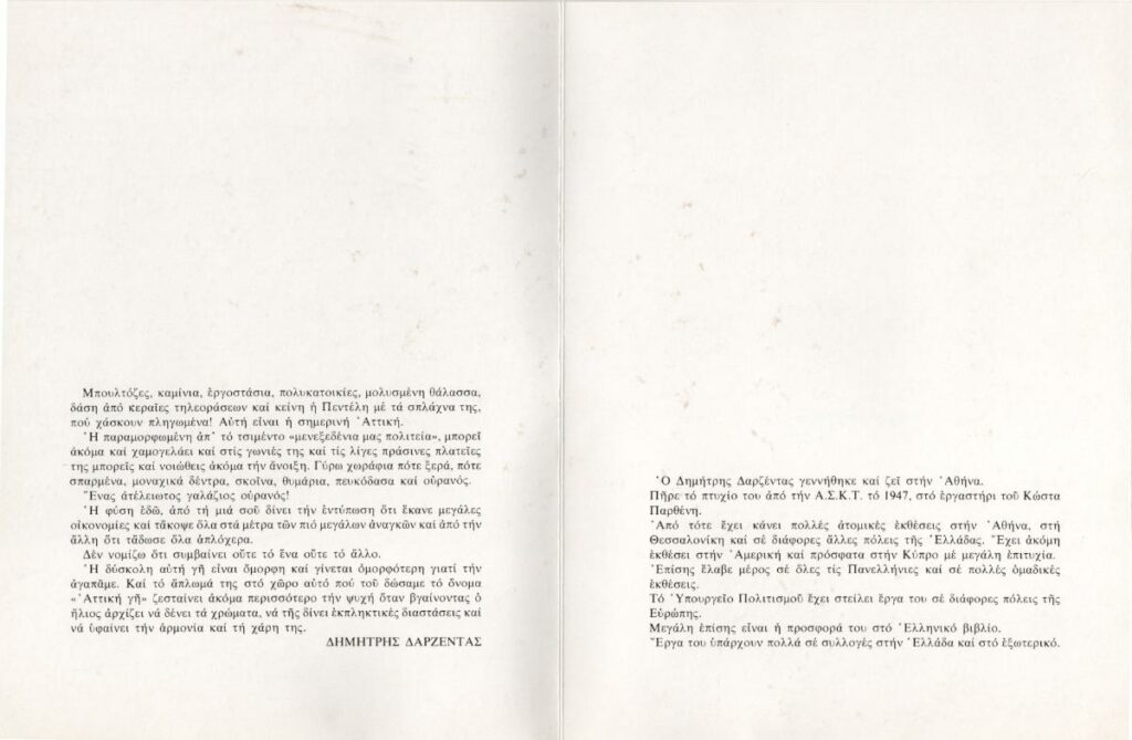 Pamphlet for Dimitris Darzentas’ solo exhibition at the “Nees Morfes’ Gallery in Athens. It includes a text by the artist, a short biography, and photographs of some of the works.