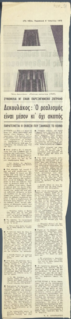 A clipping from the newspaper “Ta Nea”, dated April 6, 1973, featuring an nterview of the artist with K. D. Linardatos on realism in his work regarding the extension of his exhibition in Athens.
